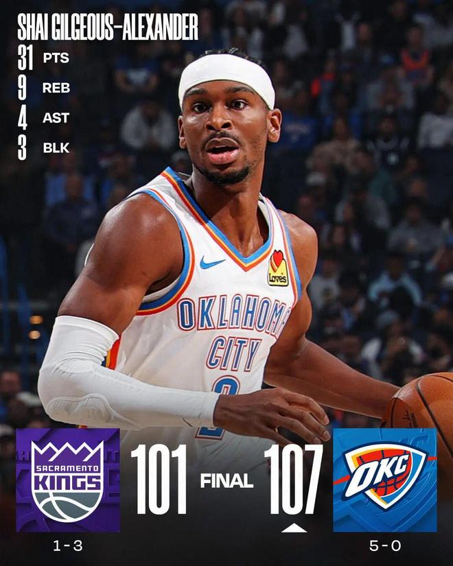 - 2025年10月29日 雷霆逆转国王开季5-0!亚历山大31分 切特缺阵 威少16+9
